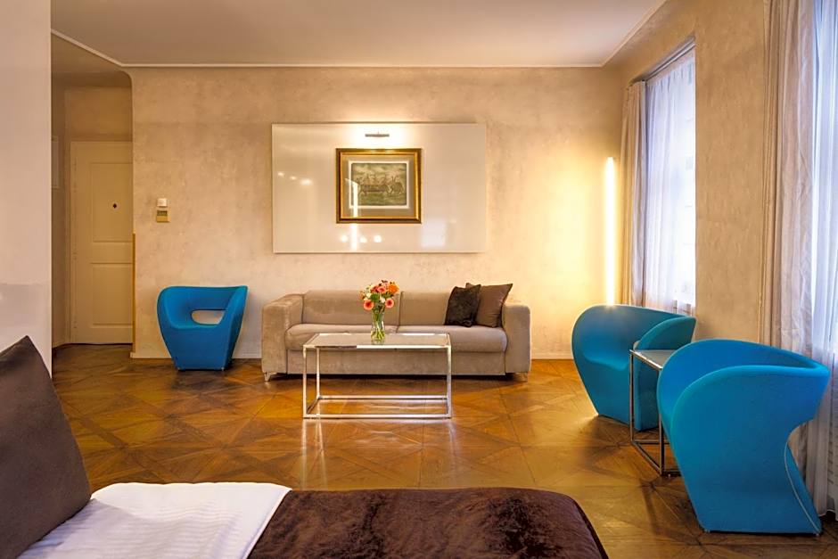 This room offers a spacious seating area and a complimentary bottle of wine. Some rooms have painted wooden ceilings or views over Prague Castle